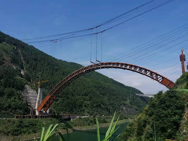 該橋?yàn)榉菍ΨQ上承式鋼管混凝土拱橋,主跨292米,在同類型橋梁中居世界第一,采用跨度865米的2×150噸纜索起重機(jī),在國內(nèi)首次實(shí)施兩片拱肋同時整節(jié)段吊裝,主拱于2019年7月31日合攏。