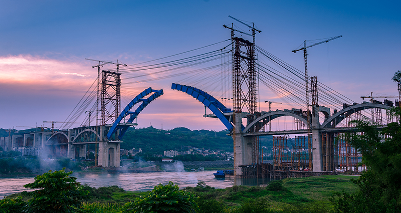 該橋?yàn)閲?guó)內(nèi)跨徑大的中承式公鐵兩用鋼箱拱橋,主跨336米,采用400噸纜索起重機(jī)吊裝施工,主拱于2017年6月合龍,合龍精度4毫米。