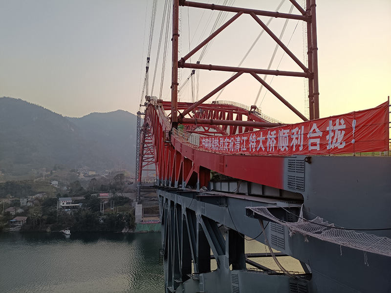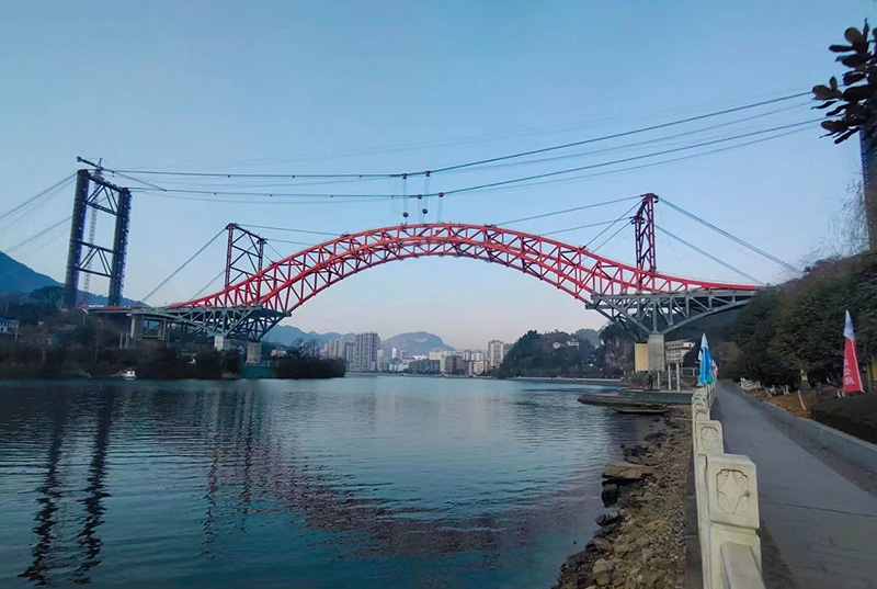 湖北長(zhǎng)陽清江特大橋全長(zhǎng)354.8m,主橋?yàn)?20m飛燕式鋼桁架系桿拱橋,采用2*80噸纜索吊機(jī)安裝,主拱于2021年1月14日合龍。