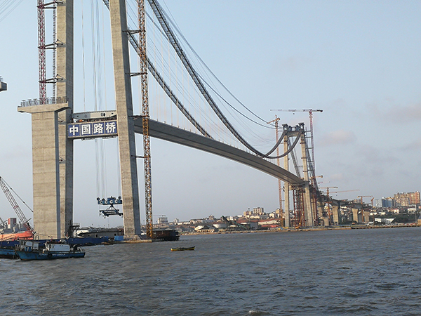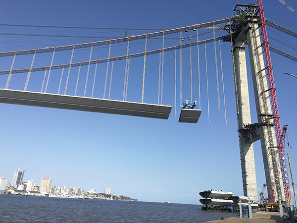 該橋?yàn)殇撓淞簯宜鳂颍骺?80米,全長(zhǎng)3034米,采用2×125噸纜索起重機(jī)及旋轉(zhuǎn)吊鉤,25天完成橋面鋼梁安裝,該橋建成后成為非洲第一大懸索橋。